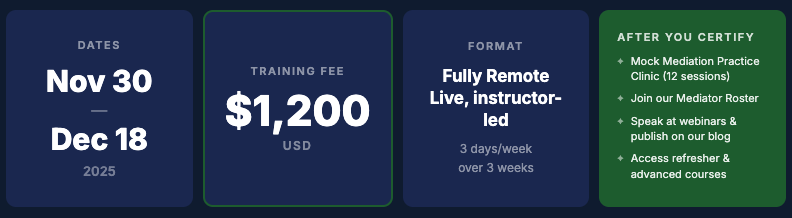 Thank you for your interest in our Mediation Skills Training & Certificate Program. You’re one step closer to joining a select cohort of professionals building practical, real-world mediation skills for today’s complex disputes.